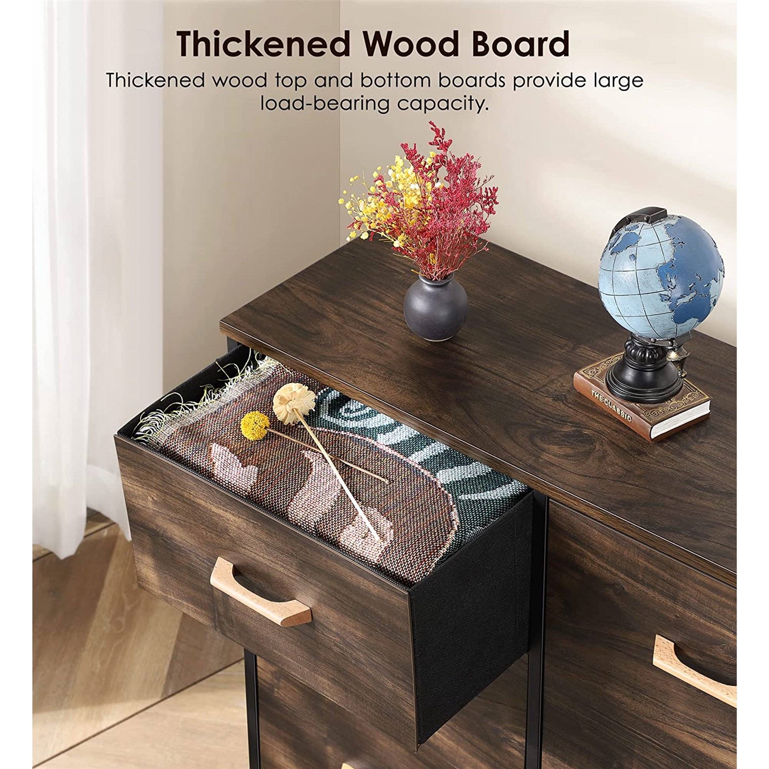 - Wood Dresser: Top&bottom boards, drawer front sides and feet are made of wood. This wood dresser matches well with most home styles.