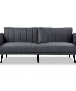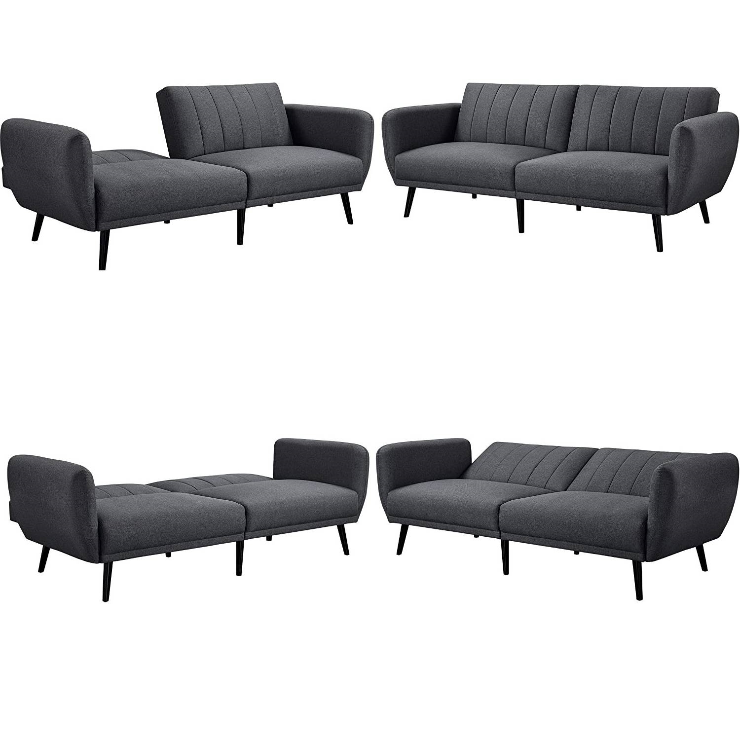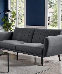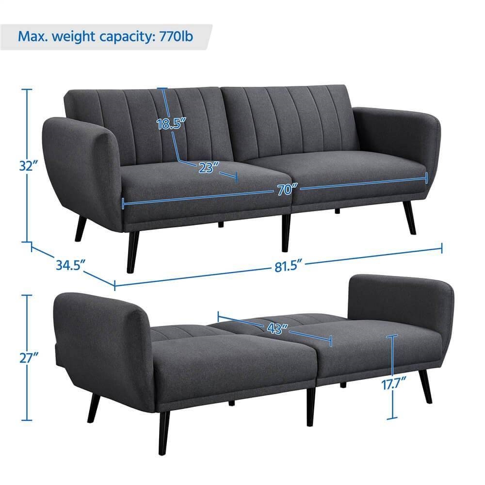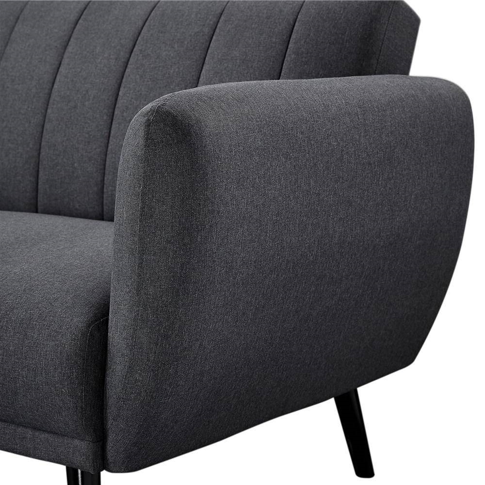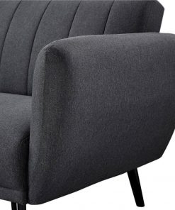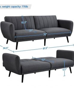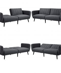 A modern Scandinavian time piece that is perfect for any living room. This Scandinavian Dark Grey Linen Upholstered Convertible Sofa w/ Wooden Legs is made from 100% polyester upholstery with extra thick high density foam padding that’s great for high wear, easy to clean, and provides maximum comfort for sitting and/or sleeping. This sofa has 3 convertible positions for sitting, lounging and sleeping, so it can be a comfy sofa for daily use or a temporary bed for guests. Has a split back design that allow for easy push and pull mechanism. There are 2 fold-out metal support legs hidden in the zipper compartments of the sofa back.