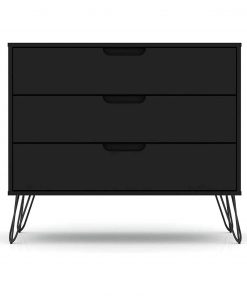 Bring some modern style to your home with this Mid-Century style dresser. This Modern Scandinavian Style Bedroom 3-Drawer Dresser in Black Wood Finish will fit into even the smallest of homes while still bringing sleek and practical style. With ample storage and minimalistic mid-century modern style, the Modern Scandinavian Style Bedroom 3-Drawer Dresser in Black Wood Finish is the perfect accompaniment to any bedroom space. Cutout handles keep the piece feeling fresh, and triple drawers offer plenty of space for clothing, personal items, and more. A display top provides space for showing off a decorative lamp or for sharing favorite framed family photos, travel trinkets, and perfume trays. Set this dresser under a mirror or painting to complete your space and create an instant bedroom focal point. It won’t take up much room but will seriously deliver on quality and style. This piece is made of high-quality solid wood with metal accents to ensure durability and lasting beauty. Choose between cutout edge handles or a flush design to make this piece truly your own. Undeniable quality, a stunning look, and convenient storage come together to make this piece a must-have for any home or apartment.