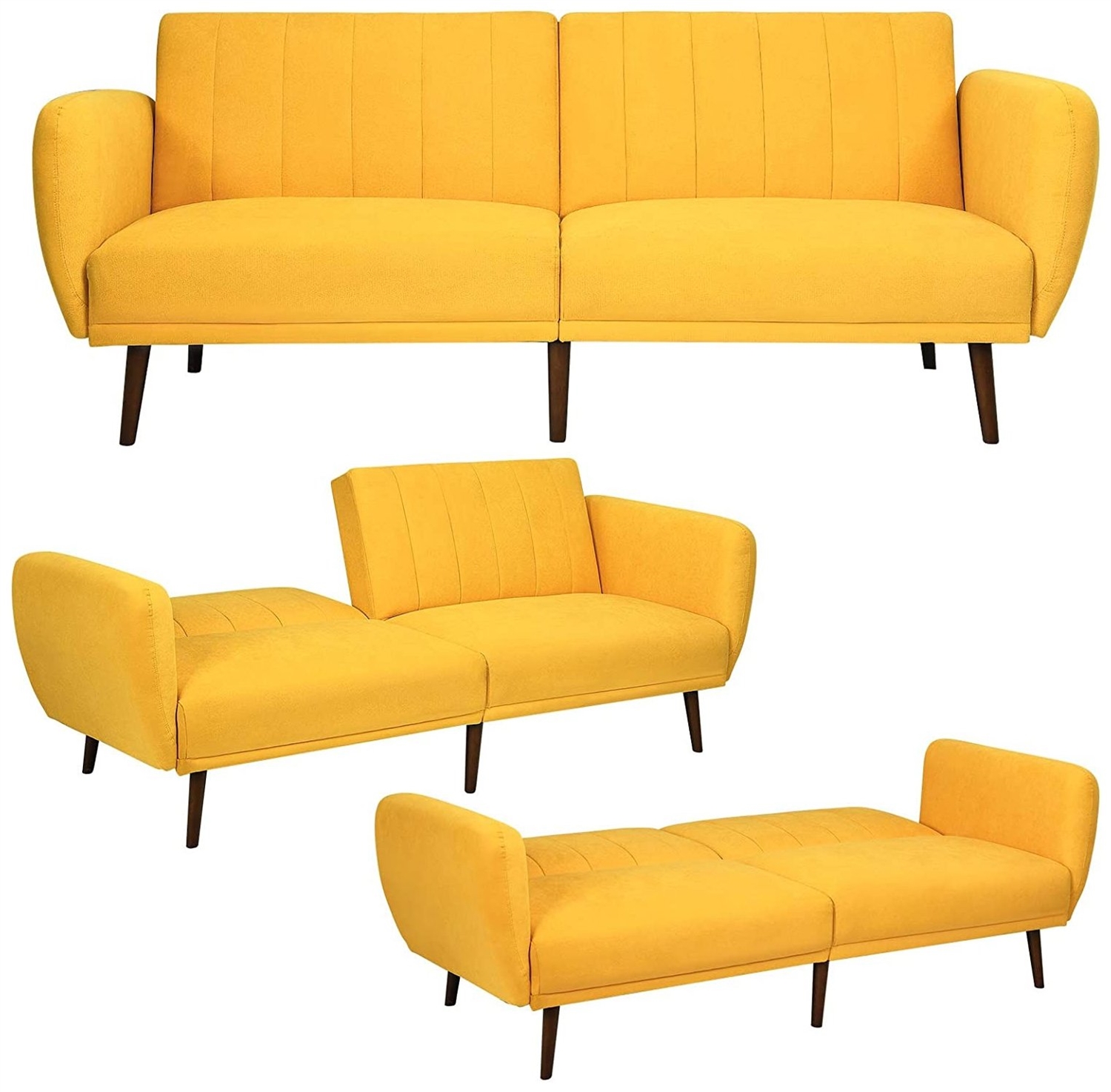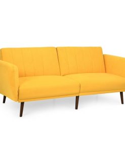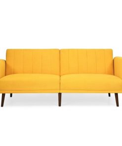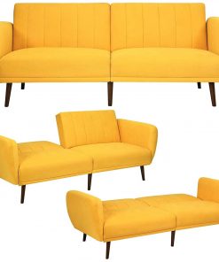 This Modern Scandinavian Yellow Linen Upholstered Sofa Bed with Wooden Legs is a perfect addition to any living room. This Scandinavian Linen Upholstered Convertible Sofa is made from skin-friendly cotton and linen fabric with extra thick high density foam padding that’s great for high wear, easy to clean, and provides maximum comfort for sitting and/or sleeping. This sofa has 3 convertible positions for sitting, lounging and sleeping, so it can be a comfy sofa for daily use or a temporary bed for guests. Has a split back design that allow for easy push and pull mechanism.