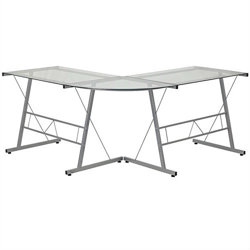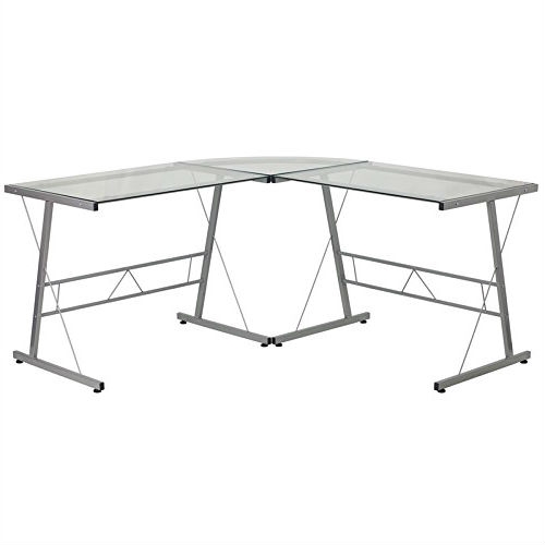 Modern Silver Metal L-Shaped Desk with Glass Top and Floor Glides