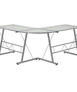 This Modern Silver Metal L-Shaped Desk with Glass Top and Floor Glides provides a perfect solution when needing a larger workspace. The glass top and silver frame provides a modern appeal. Investing in a desk for your home makes working from home or managing household bills and paperwork a nicer experience. The design of this desk is sure to complement any work space.