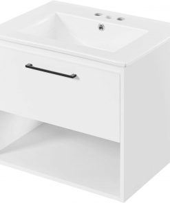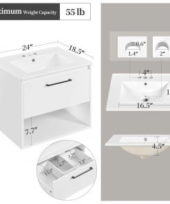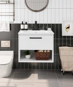 This Modern Wall Mounted Bathroom Vanity in White Wood Finish with Ceramic Sink because of its hanging design to avoid contact with the ground moisture, to ensure its dryness as well as long service life. Mounting directly to the wall, this 20″ height wall-mounted bathroom vanity is made of CARB P2-compliant MDF and a freestanding ceramic sink, which withstands greater pressure, guarantees durability and longevity without the risk of cracking. Storage under the wall mount cabinet is more flexible. According to different use scenarios, you can save space to place shelves or hooks, etc., to place some towels, hats, and other items. Wall-mounted cabinets are overhanging on the wall, completely avoiding clean-up dead spots and cleaning up stress-free. The fine surface finish and ceramic are highly easy to clean, allowing for effortless maintenance to keep it smooth and shining. Characterized by sleek lines, fashionable handles, and a sophisticated exterior, this 20″ tall bathroom cabinet adds a modern and elegant touch to your bathroom décor, creating an inviting and aesthetically pleasing ambiance.