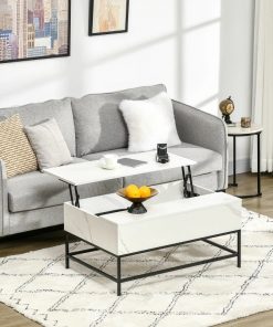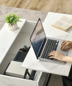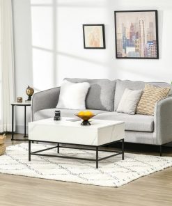 This Modern White Lift Top Coffee Table w/ Hidden Storage Black Metal Legs can be lifted up and forward, creating a perfect surface for working or dining. A high-quality gas lift device allows the coffee table to be raised and lowered safely and quietly. Under the tabletop of this modern coffee table is a large compartment designed to store different items such as magazines, laptops, remote controls, and game controllers. Made of high-quality P2 grade MDF board and industrial-style metal legs.