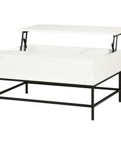 This Modern White Lift Top Coffee Table w/ Hidden Storage Black Metal Legs can be lifted up and forward, creating a perfect surface for working or dining. A high-quality gas lift device allows the coffee table to be raised and lowered safely and quietly. Under the tabletop of this modern coffee table is a large compartment designed to store different items such as magazines, laptops, remote controls, and game controllers. Made of high-quality P2 grade MDF board and industrial-style metal legs.
