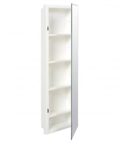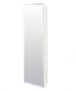 An essential for any bathroom, this Narrow Bathroom Medicine Cabinet Frameless Mirror 12 x 36 inch keeps prescriptions, bandages, toiletries, and more in one centralized location while helping complete the look above your bathroom vanity. The bathroom medicine cabinet’s mirrored door allows you a quick preen before you leave the loo while its frameless design blends seamlessly with any existing decor. Its streamlined silhouette coupled with Its beveled edges and concealed hinges gives this cabinet a modern feel. Fusing function with fashion, the cabinet’s white plastic body houses four adjustable plastic shelves. Recess mount installation fits flush inside your wall and takes up less space. Plus, this product comes with a one-year warranty.