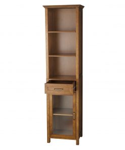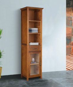 This Oak Finish Bathroom Linen Tower Storage Cabinet with Shelves with crown molding on the top combines a traditional style and storage for any bathroom. Its design offers plenty of storage with one door and one drawer with adjustable shelves and two open shelves making it easy to store items of different heights. The metal glider drawer allows for easy open and close operation. The tempered glass-paneled doors provides a clear view into the cabinet, and features a metal handle for easy opening. This sturdy cabinet comes with assembly hardware.