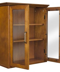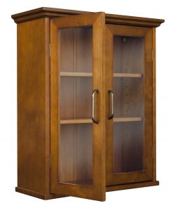 This Oak Finish Bathroom Wall Cabinet with Glass 2-Doors & Shelves offers storage with style for the bathroom. Its elegant crown top molding and adjustable shelf helps make it easy to store items of different sizes. The tempered glass-paneled doors provides a clear view into the cabinet. The cabinet features metal knobs for easy opening. This sturdy cabinet comes with assembly hardware.
