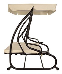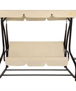 This Outdoor 3-Seat Canopy Swing with Beige Cushions for Patio Deck or Porch combines comfort, durability and beauty for a great addition to any porch or patio. Built from premium materials such as steel for the frame, Textilene for the mesh seat, and PA-coated polyester for a water and fade resistant canopy. This bench seats three with a maximum combined weight of 530lbs. What’s more, this model converts into a lay flat futon style bed, and features a small cup holder and tray on each side.
