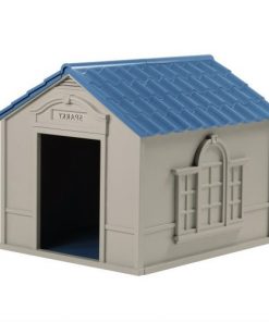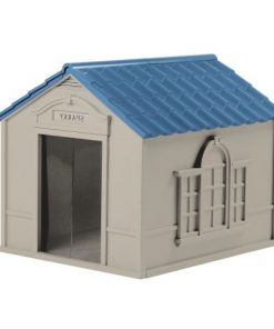 This Outdoor Dog House in Taupe and Blue Roof Durable Resin – For Dogs up to 100 lbs is easy to snap together assemble, no tools required. Includes vinyl doors and letters to personalize with your pet’s name.