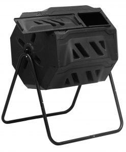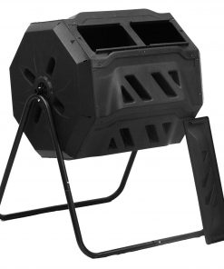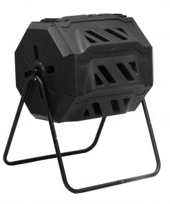 The Outdoor Garden 5.7 Cubic Ft Rotating Composting Bin Tumbler is an affordable composter with some great features. Sized to accommodate the needs of a small to average sized garden, the dual chambers can hold up to 5.7 cubic feet (42 gallons). Because they are separated, you can run batches independently, getting compost even faster than a single batch tumbler. Because of the smooth turning and tumbling action, the compost material can break down into earthy hummus in as little as 30 days. Aeration is strategically located along the outsides of the bin to allow optimal airflow with minimal mess. The sliding door has no moving parts and can be pushed to the side to open. While it’s easy for you, it’s not easy for critters to get in. The low odor design is also very tough and can stand up to weather and moderate impacts. The coated, tubular frame is also tough, able to support a fully loaded composter with ease. The hand holds are great for gripping and also provide agitation for the material inside, breaking up material. Best of all, the bin is made of 100% recycled plastic.