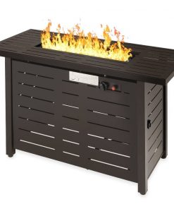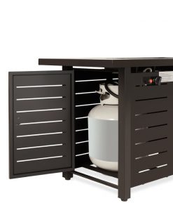 Relax and stay warm all winter long with this 50,000 BTU Brown Steel LP Gas Propane Fire Pit w/ Auto Ignition. Change and conceal your gas tank quickly with a convenient tank holder hidden behind a side door that works with a standard 20 lbs. propane tank. Propane tank is not included. Heavy-duty rust- and weather-resistant steel panels with a matching frame protects a powerful heating element and ensures years of outdoor heating. Enjoy an elegant accent to your burner, or cover the burner and have an attractive table to share light meals and drinks with guests. A durable nylon cover ensures this fire pit table will withstand the elements when not in use.