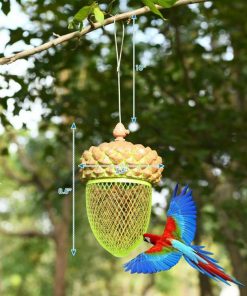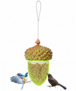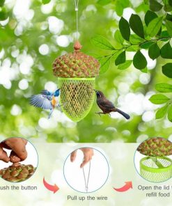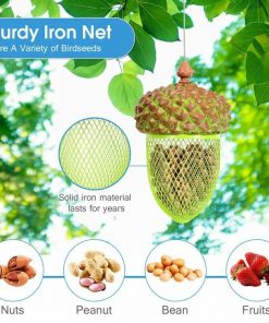 Unlike common bird feeders in the market, this Outdoor Metal Mesh Bird Feeder with Metal Acorn Roof boasts a delicate retro acorn shape. The classic acorn shape not only serves as a perfect addition to your garden and backyard but also attracts more lovely birds, transforming your yard into a natural paradise surrounded by colorful birds. Premium iron cages are long-lasting and durable, which comes with a long working life. More importantly, the wear-resistant iron mesh is designed to withstand chewing and tearing. Surely, sturdy enough materials leave you no worry about using reliability. The bird feeder comes with a special locking mechanism to keep squirrels or other animals from lifting the lid and gaining access to the seed reservoir, which effectively protects the food. Plus, the grid design also perfectly holds peanut chunks, sunflower seeds, nuts, etc. Conforming to offer the maximum convenience, the acorn hanging bird contains steel wire. You can easily hang the feeder in the backyard, garden, deck, balcony or front porch. Apart from that, the metal mesh allows you to clearly observe food reserves, convenient to refill the food. Feed and watch wild birds in your yard with this acorn hanging bird! It serves to attract the most beautiful birds and offers a vibrant scene for you. Feeding varieties of birds and enjoying birds singing allow you to fully enjoy nature. Colorful birds transform your backyard into a small corner of paradise.