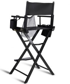 This Outdoor Patio Folding Directors Chair with Foot Rest and Drink Holder in Black is ideal for professional makeup artists, motion picture directors, actors or staffs. This chair designed with a sturdy solid hardwood frame offers stability and durability. It is foldable and lightweight, which makes the chair flexible and easy to transport. The only assembly-needed is the foot rest. The chair with black color is modern and classic, will never go out of style. The chair comes with a water bottle holder, two small storage pouches and one large net pouch, where you could have your makeup, accessories and personal items well ordered. The chair with solid hardwood frame meets almost all of your expectation for a makeup artist chair!