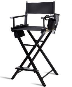 This Outdoor Patio Folding Directors Chair with Foot Rest and Drink Holder in Black is ideal for professional makeup artists, motion picture directors, actors or staffs. This chair designed with a sturdy solid hardwood frame offers stability and durability. It is foldable and lightweight, which makes the chair flexible and easy to transport. The only assembly-needed is the foot rest. The chair with black color is modern and classic, will never go out of style. The chair comes with a water bottle holder, two small storage pouches and one large net pouch, where you could have your makeup, accessories and personal items well ordered. The chair with solid hardwood frame meets almost all of your expectation for a makeup artist chair!