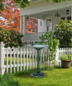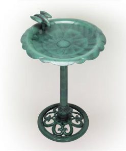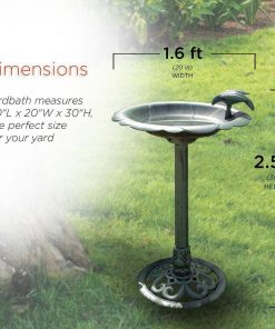 This Outdoor Polypropylene Weather Resistant Bird Bath in Dark Green Finish is sure to attract feathered friends and create a charismatic ambiance for your garden, patio, deck, yard, or other outdoor space. A shallow and wide bowl assures that multiple small birds can drink and bathe safely at the same time. A natural green finish blends into nature while the base has room to plant flowers. Polypropylene material resists rust and damage from the elements while the sturdy base prevents the birdbath from tipping over. Birdbath measures 20″L x 20″W x 31″H, the perfect size for your yard. Shallow basin allows easy access for all bird types. Fill a bath with fresh, shallow water and enjoy watching all the birds congregate from the comfort of your couch or while at the table having dinner with your family or working on art projects with the kids. This elegant birdbath is perfect for pairing with a bird feeder to coax a variety of birds outside your window during any season. With this birdbath, your yard will be the delight of humans and winged creatures alike!