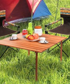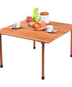 - This portable roll up camping picnic table is ideal for family reunions, picnics, camping trips, buffets or barbecues. The table comes with wood table top and wood legs, as well as carry bag.