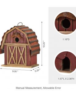 Constructed of high quality natural solid wood and metal, eco-friendly and safe, This Outdoor Red Wood and Metal Barn Style Hanging Bird House is styled in a Handmade distressed fashion,the natural looking makes it easy to blend in with your garden. This item measures Overall: 9″L X 5.25″W X 10.25″H, Entrance Hole Size: 1.18″D, Cleanout Hole Size: 1.57″L X 2.36″H, Comes with farmhouse barn-style design, detailed and accented entryway. The top of the birdhouse has a ring for hanging. To hang the birdhouse, simply attach the ring hole to a desired location (tree, house, banner, etc.) with rope or hook. If you choose to use this as a functional birdhouse, it should be cleaned out once per season to make room for the next house guest. This handcrafted farmhouse barn-style design with distressed solid wood body and rustic metal roof will add style to your backyard and offer a safe and cozy home for your lovely feathered friends. With this birdhouse, you are not only enhancing your garden but also offering your feathered friends a cozy home. We offer you and your bird friends a 100% satisfaction guarantee for this birdhouse.