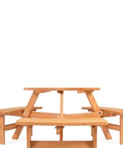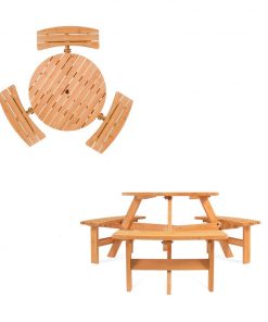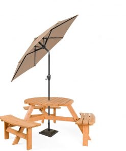 This Outdoor Circular Wooden Picnic Table w/ Benches Umbrella Hole – Seats 6 is perfect for a meal in any area of your backyard – place it on the patio, in your garden, or underneath your favorite tree. The picnic table holds a maximum of 500 pounds, allowing up to 6 adults to gather ’round on connected benches for good food and company; accommodates 2 people per bench. A drilled hole in the center of the table is the perfect size to fit a patio umbrella and provide shaded outdoor lounging. Umbrella not included.