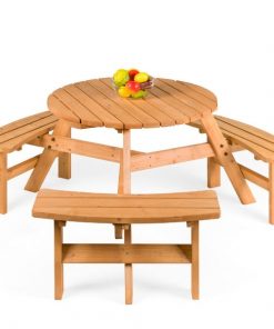 This Outdoor Circular Wooden Picnic Table w/ Benches Umbrella Hole – Seats 6 is perfect for a meal in any area of your backyard – place it on the patio, in your garden, or underneath your favorite tree. The picnic table holds a maximum of 500 pounds, allowing up to 6 adults to gather ’round on connected benches for good food and company; accommodates 2 people per bench. A drilled hole in the center of the table is the perfect size to fit a patio umbrella and provide shaded outdoor lounging. Umbrella not included.