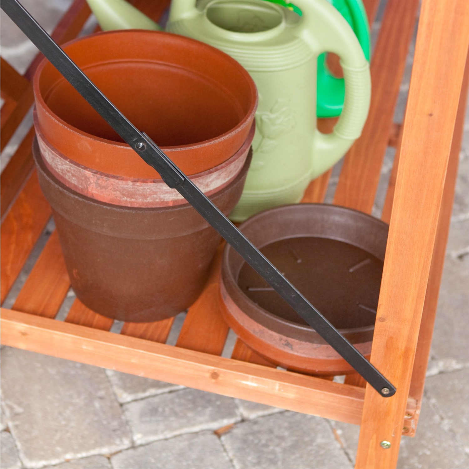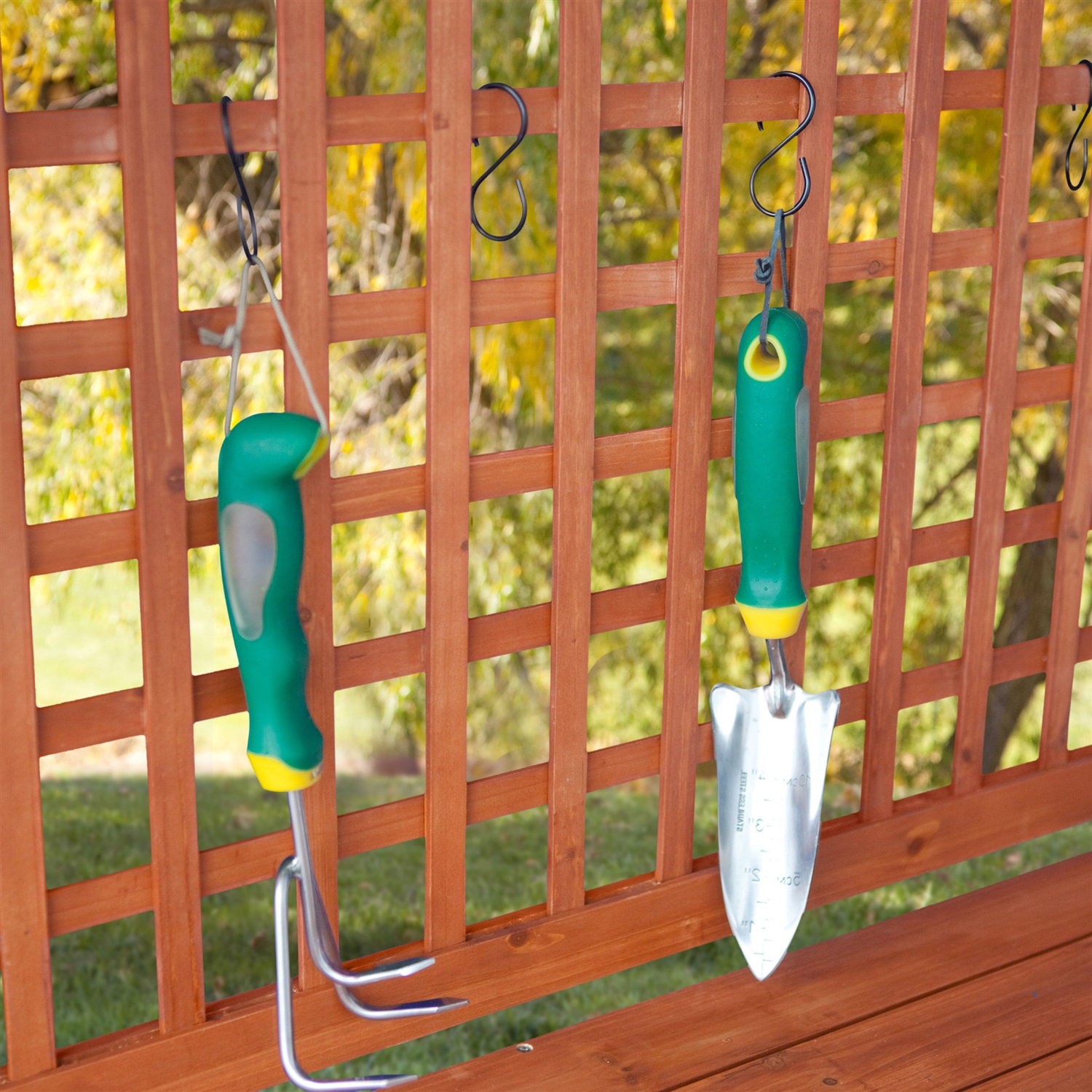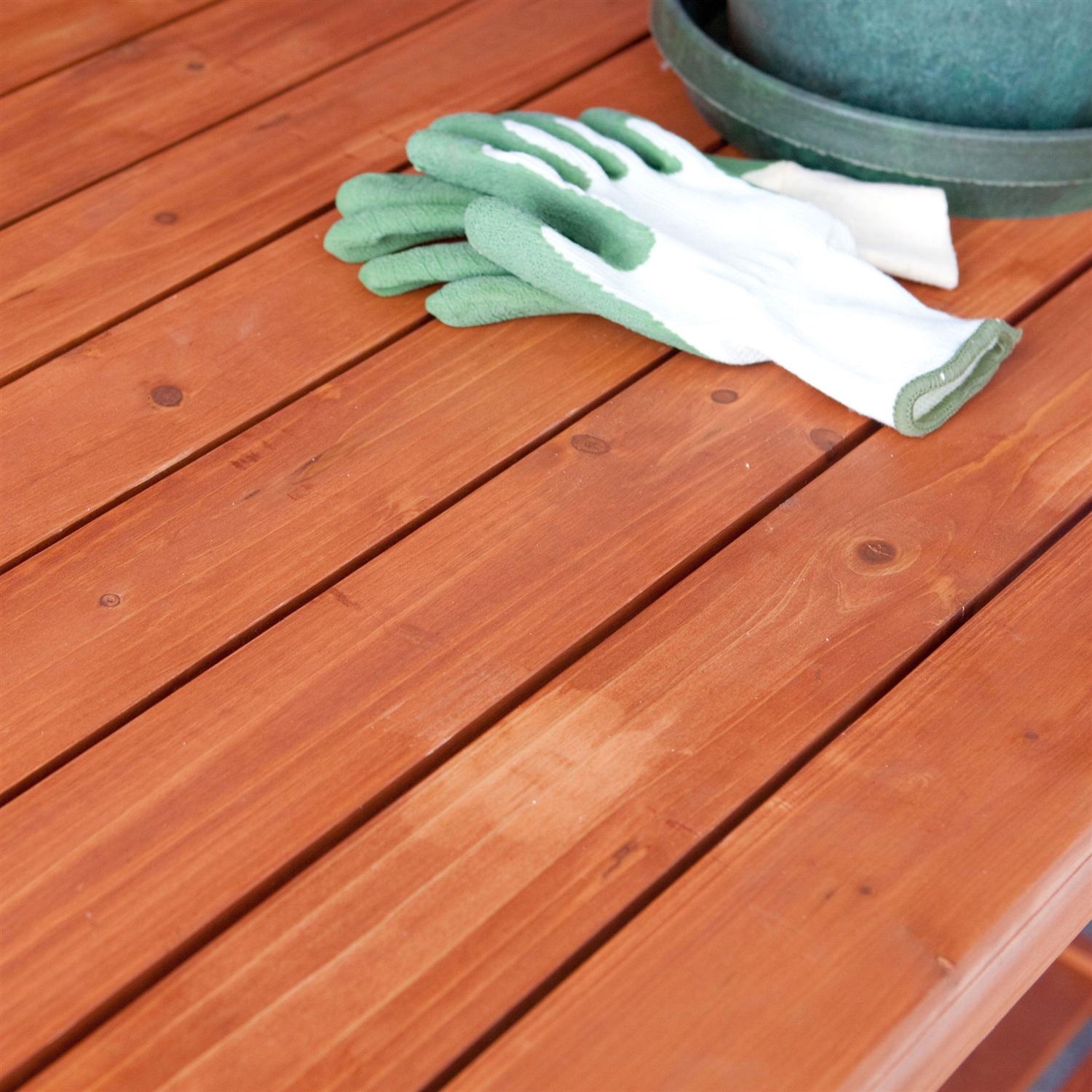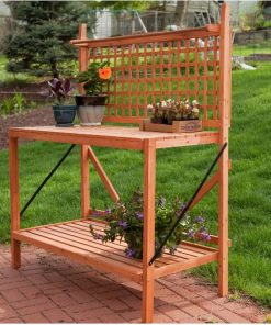 Create the ideal place to get creative with your favorite plants and flowers with this Outdoor Weather-Resistant Fir Wood Potting Bench Garden Table with Lattice Back. Made with naturally weather resistant fir wood, it gives you the height and workspace you need to start seeds, pot plants, or maintain potted flowers. It features an ample workspace with lower shelving for larger items and top shelving for tools and finished flowers. Put it anywhere you want to work out your green thumb.
