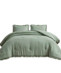 Transform your bedroom in a sophisticated and luxurious manner with this King Oversized Sage Stone Washed Ruffled Edge Microfiber Comforter Set. An attractive ruffled edge trim with an elegant yet simple presentation that makes you feel right at home. Fashionably providing everyday comfort. Lightweight, high loft comforter with adequate warmth for year-round use. The comforter is made of 100% microfiber polyester, giving a super soft smooth, and cozy feel. The fabric is stone-washed which creates a natural attractive crinkled fabric effect to enhance the aesthetics of the comforter.