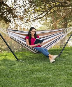 This Portable Cotton Hammock in Desert Stripe with Metal Stand and Carry Case is designed to keep you relaxed and comfortable in any outdoor space. It is able to accommodate two adults (up to 450 lbs. collectively), allowing you and a friend to enjoy sharing the hammock on a warm, sunny day. For convenience and durability, it includes a stand that is constructed of sturdy, all-weather resin steel, saving you the hassle of having to purchase a stand separately. With the included carrying case, you can easily pack the hammock and take it anywhere you please with ease.