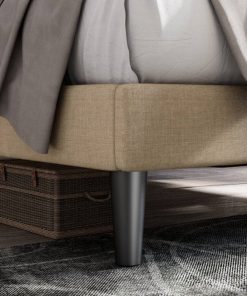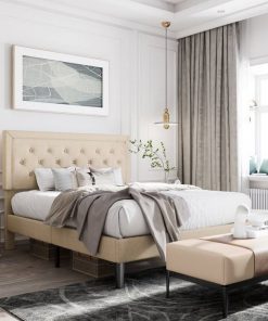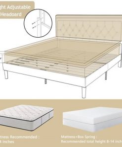 Upholstered linen and tufted button headboard, this classic silhouette matches a variety of bedroom styles. Thick dense foam padding gives you comfortable touch. The Interior steel framework supports your mattress firmly. Smartly packed all parts with instructions and tools in one box. Only takes about 30 minutes to assemble. Fabric upholstered bed frame with adjustable headboard. The distance between each slat is about 4 inches. The slats of this bed have to be screwed on and not hook & loop fastener. 6″ is a little low for the bed, but you can still use it if you do not care about the gap between the mattress to the headboard.