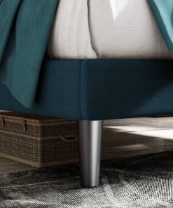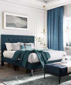 Upholstered linen and tufted button headboard, this classic silhouette matches a variety of bedroom styles. Thick dense foam padding gives you comfortable touch. The Interior steel framework supports your mattress firmly. Smartly packed all parts with instructions and tools in one box. Only takes about 30 minutes to assemble. Fabric upholstered bed frame with adjustable headboard. The distance between each slat is about 4 inches. The slats of this bed have to be screwed on and not hook & loop fastener. 6″ is a little low for the bed, but you can still use it if you do not care about the gap between the mattress to the headboard.