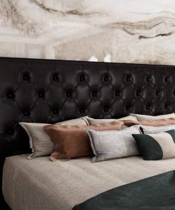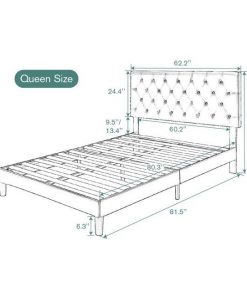 This low-profile Faux Leather platform bed brings sleek style to your bedroom or guest room. It features a metal and engineered wood frame, with a finished back and tapered legs; the headboard is padded with foam and upholstered in faux leather, with distinctive button tufting for a tailored look. This bed accommodates up to 800 lbs.; it comes with 12 slats and three center support legs, offering added stability. While this piece does not require a box spring, recommended use with a 10 inch thick mattress (not included). This platform bed completes the look in any traditional or glam setting.