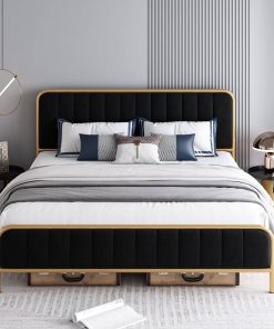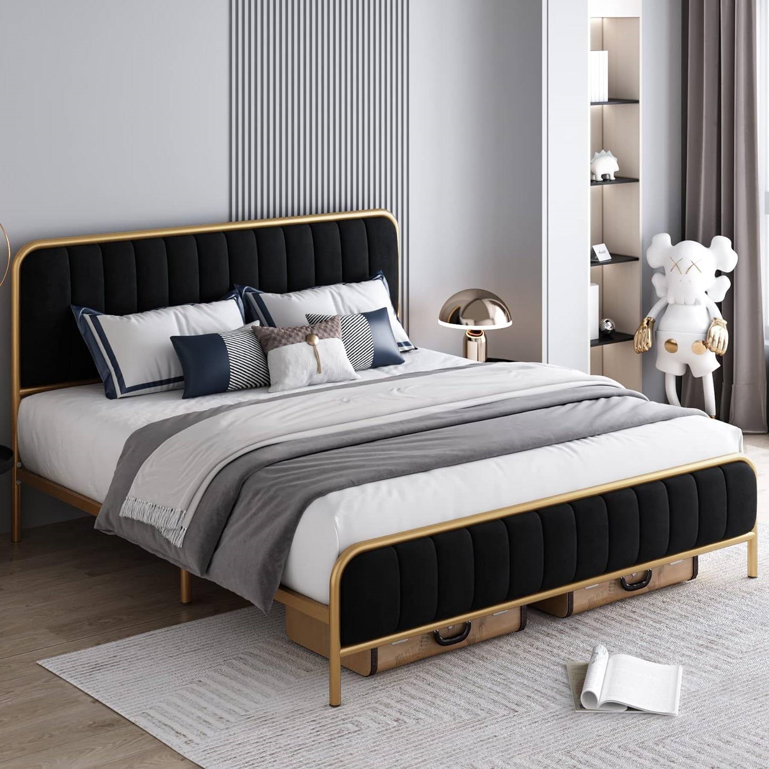 - Queen Gold Metal Platform Bed Frame with Black Velvet Upholstered Headboard