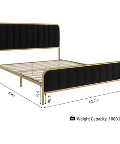 With a tufted headboard design and golden metal foundation, this Queen Gold Metal Platform Bed Frame with Black Velvet Upholstered Headboard will look classic in any bedroom. Perfect for modern bedrooms, the upholstered platform bed frame is not only stylish but functional as well. The soft-packed part of bed frames padded headboards are made of high-quality Velvet wrapped with high resilience sponge, perfect for sitting on this bed to read the books or playing an iPad. This is a comfortable height. 9.6 inches storage space beneath the bed frame, put some boxes or clothes or shoes for you, it can make room more tidy. The platform bed is made of a premium metal frame. 12 pcs strong wood slat support which provides firm, rigid support to your mattress. Ensures no shaky, squeaky and noise. Sturdy as well as pretty. Load Capacity up to 1000lbs. Everything you need for assembly comes zipped up in a compartment behind the headboard for convenience. No additional tools or parts are needed. Start to enjoy the fun of DIY according to the clear instructions. (PLEASE NOTE: MATTRESS SOLD SEPARATELY).