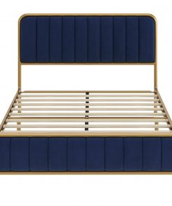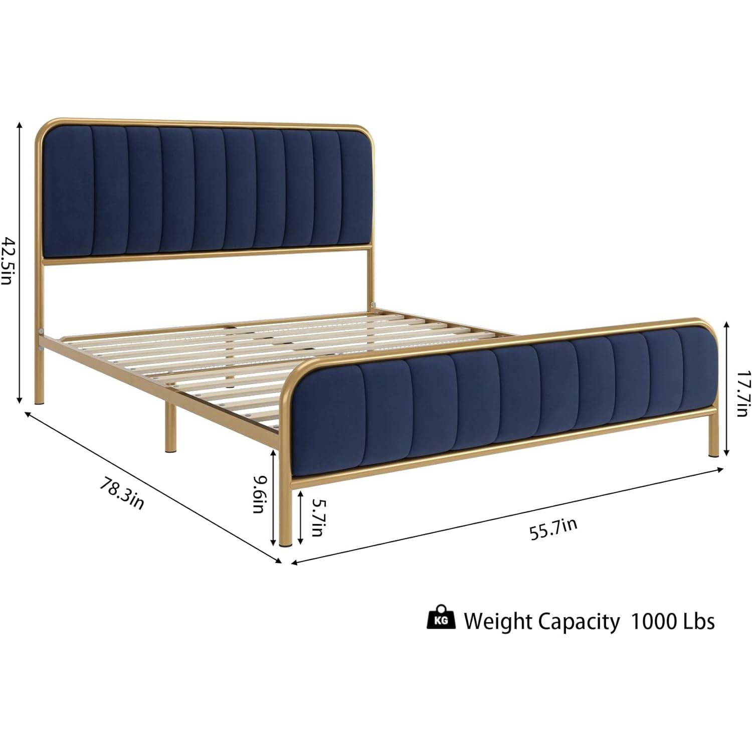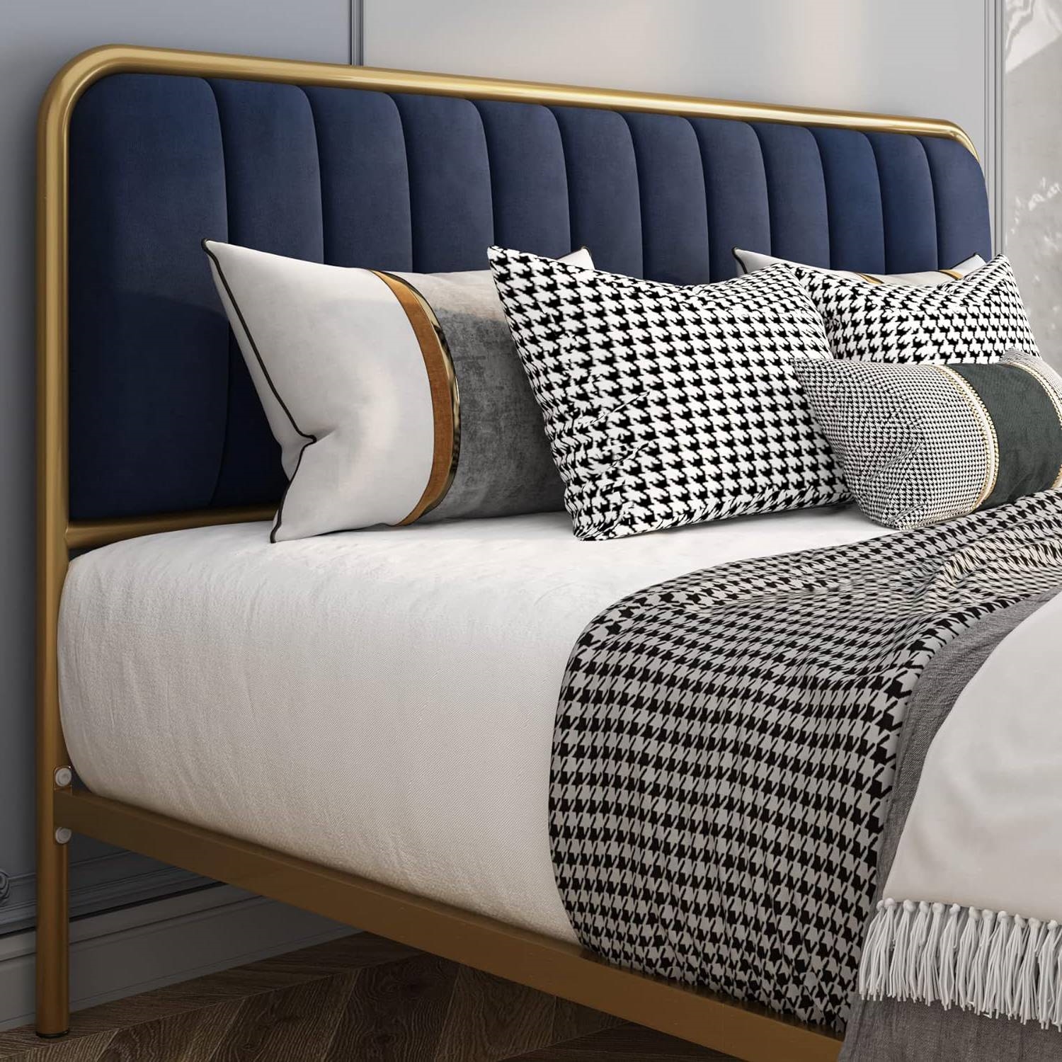- Queen Gold Metal Platform Bed Frame with Navy Blue Velvet Upholstered Headboard