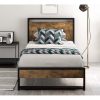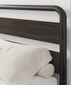 - Queen Heavy Duty Round Metal Frame Platform Bed with Black Wood Panel Headboard