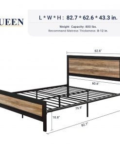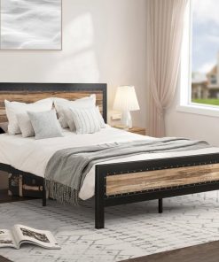 Elevate your bedroom with this Queen Industrial Metal Wood Rivet Platform Bed Frame w/ Headboard and Footboard featuring unique industrial-style strip wood accents framed in frosted metal with decorative rivets, creating a one-of-a-kind style statement. Crafted to last, this metal bed frame is built to withstand everyday use while maintaining its unique appearance, designed to provide a reliable foundation for your sleep. Setting up your bed is straightforward with clear instructions and labeled parts, ensuring a hassle-free assembly process. The bed’s raised design creates valuable under-bed space, perfect for storage boxes, bins, or even a robot vacuum, simplifying your room organization. Rest in peace and quiet with this bed frame’s meticulously engineered noise-free construction, ensuring an undisturbed night’s sleep and a peaceful resting experience.