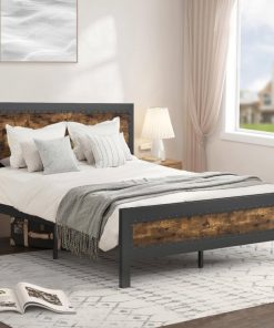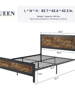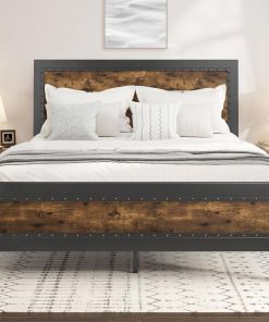 Elevate your bedroom with this Queen Industrial Rivet Platform Bed Frame with Headboard in Rustic Wood Finish featuring a rustic brown wormhole pattern and framed in sleek metal with decorative rivets. It’s a one-of-a-kind statement piece. Crafted to last, this metal bed frame is built to withstand everyday use while maintaining its unique appearance, designed to provide a reliable foundation for your sleep. Setting up your bed is straightforward with clear instructions and labeled parts, ensuring a hassle-free assembly process. The bed’s raised design creates valuable under-bed space, perfect for storage boxes, bins, or even a robot vacuum, simplifying your room organization. Rest in peace and quiet with this bed frame’s meticulously engineered noise-free construction, ensuring an undisturbed night’s sleep and a peaceful resting experience.