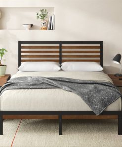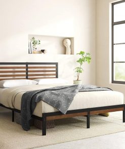 The Eco Friendly Bamboo Metal Platform Bed Frame is beautifully designed to fit your industrial or modern aesthetic. Its slatted headboard and low-profile footboard are both made from beautifully finished sustainable bamboo, while the rest of the frame is constructed with sturdy steel. With its clean-lined silhouette, this modern bed enhances your primary suite, kids room, or guest room with style and function. Designed for use without a box spring, you can rest your mattress directly onto the metal slats for long lasting support. Headboard and footboard are made from sustainable bamboo with exceptional durability and a beautiful look, so you get peace-of-mind in addition to great rest. All of the parts, tools, and instructions needed for easy setup are included in one compact box that ships to your door directly.