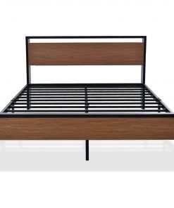 - Queen Metal Platform Bed with Walnut Finish Wood Panel Headboard Footboard