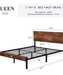 This Queen Modern Metal Platform Bed Frame with Rustic Wood Headboard and Footboard is with beautiful headboard & footboard, Rustic Country, Antique or Retro industrial, suitable for any bedroom style decoration. 11 clearance, with plenty of under bed space for storage. Specially thickened metal beams in the middle and both sides of the bed; 12 steel support slats and multiple sturdy middle support feet; stable & durable enough to provide good sleep. Fixed buckle and EVA noise-free tape on beams are added, to reduce shaking and friction between metals, and types of efforts to minimize noise. All tools, parts, and instructions are included for stress-free assembly that takes less than one hour, or easily disassemble for moving. Our platform beds are expertly engineered to be simple and easy to enjoy every single day.