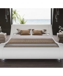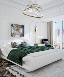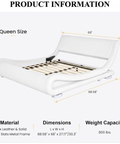 - Queen Modern White Upholstered Platform Bed Frame with Sleigh Curved Headboard