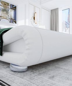 The Queen Modern White Upholstered Platform Bed Frame with Sleigh Curved Headboard has a streamlined design along with a curved headboard which makes your room a contemporary and futuristic aesthetic. 120° 2-level adjustable height headboard gives the waist a comfortable rest, perfect for reading, playing mobile phones, watching TV, etc. The sturdy construction is composed of solid wood slats and heavy-duty steel with a bold round-shape leg design. No squeaky sound. Maximum capacity 800 lbs. Fully embedded design can prevent the mattress from sliding and provide a sweet dream. Mattress + spring box is recommended not to exceed 14 inches. 100% Premium PU leather filled with high-density PP cotton, ultra-soft texture, breathable, easy to clean, wear-resistant.