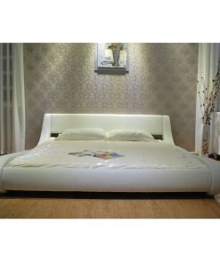 You will love the sleek curvature and contemporary design of this Queen Modern White Upholstered Platform Bed with Curved Sides & Headboard. Covered in man-made leather, this bed comes with slats so there is no need of a bunkey board or spring box when adding this bold piece to your room. The bed is around 90″(L)*72″(W)*30″(H). bedding and mattress are not included. Finish: White.