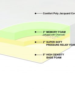 - Mattress layers: 3″ memory foam, 2″ Super Soft Foam with pressure relief system and 5″ high density foam