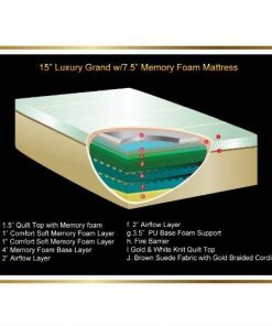 Introducing the Queen size 15-inch Thick Memory Foam Mattress – 5lb Memory Foam. Compares to the Tempur-Pedic® the GrandBed. Made of 7.5″ 5lb visco elastic memory foam and 7.5″ high resilience polyurethane foam with air flow system to help keep mattress temperature low. Each layer is uniquely designed and positioned to provide a plush sleep surface, durability, support and a total comfort experience. Three layers of polyurethane foam are covered by four layers of memory foam. Responds to your body’s temperature and contours to your body’s shape to minimize pressure points and reduce tossing and turning. The beautiful and luxurious cover combines a brown suede side fabric with a stretch knit on top. The mattress is channel quilted with a gold braided piping around the perimeter completing the design. Don’t be fooled into buying a brand name product for no reason. Our mattress is guarantee to feel and perform the same or your money back. Memory foam mattresses are the most popular mattresses we sell. Allergen and dust-mite resistant! No assembly required, mattress is rolled and compressed for shipping. The mattress will conform to its proper size within 1 – 2 hours. Mattress only! Foundation and bed frame not included. Heights are approximate.
