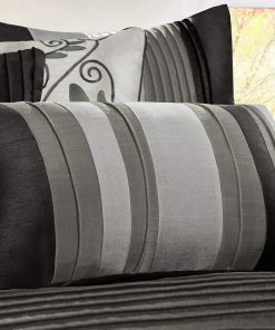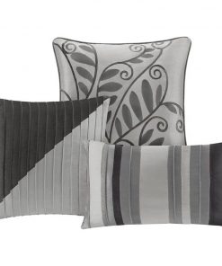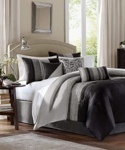 Relax in complete luxury with this Queen Size 7 Piece Bed In A Bag Comforter Set Faux Silk Black Gray Stripes. Sleek piping of the fabric on the comforter set and pillows gives a strong visual dimension. Everything is included with this jumbo set. Come with Comforter, Bed Skirt, 2 Pillow Shams, 3 Decorative Pillows! Machine wash, gentle cycle and separately. Tumble dry low. Spot clean decorative pillows.