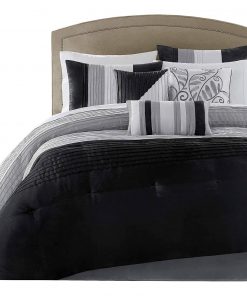 Relax in complete luxury with this Queen Size 7 Piece Bed In A Bag Comforter Set Faux Silk Black Gray Stripes. Sleek piping of the fabric on the comforter set and pillows gives a strong visual dimension. Everything is included with this jumbo set. Come with Comforter, Bed Skirt, 2 Pillow Shams, 3 Decorative Pillows! Machine wash, gentle cycle and separately. Tumble dry low. Spot clean decorative pillows.