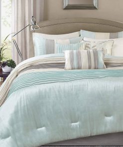 Relax in complete luxury with this Queen Size 7 Piece Bed In A Bag Comforter Set Faux Silk Blue Stripes. Sleek piping of the fabric on the comforter set and pillows gives a strong visual dimension. Everything is included with this jumbo set. Come with Comforter, Bed Skirt, 2 Pillow Shams, 3 Decorative Pillows! Machine wash, gentle cycle and separately. Tumble dry low. Spot clean decorative pillows.