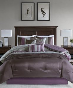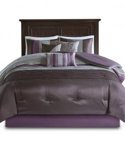Relax in complete luxury with this Queen Size 7 Piece Bed In A Bag Comforter Set Faux Silk Purple Gray Stripes. Sleek piping of the fabric on the comforter set and pillows gives a strong visual dimension. Everything is included with this jumbo set. Come with Comforter, Bed Skirt, 2 Pillow Shams, 3 Decorative Pillows! Machine wash, gentle cycle and separately. Tumble dry low. Spot clean decorative pillows.