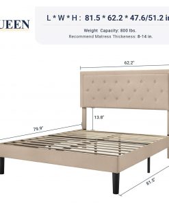 With Upholstered linen and tufted button headboard, this Queen size Beige Linen Platform Bed Frame with Button Tufted Headboard can match a variety of bedroom styles perfectly. Thick and dense foam padding gives you comfortable touch. With an interior steel framework and wood slats, it can support your mattress firmly. No box spring is needed. Smartly packed all parts with instructions and tools in one box. Only takes about 30 minutes to assemble. Fit all kinds of mattresses, spring, memory foams, latexes, or hybrid mattresses. 800 lbs weight capacity. Our platform beds are expertly engineered to be simple and easy to enjoy every single day.