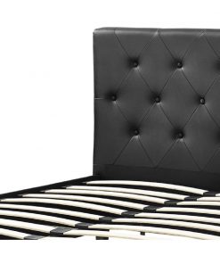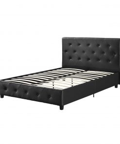 This Queen size Black Faux Leather Upholstered Platform Bed with Button Tufted Headboard boasts diamond button tufted detailing that radiates a contemporary chic look. Upholstered in faux leather with padding for extra comfort, this bed is designed to infuse some style and comfort into your room décor. Built with sturdy wooden slats for extra support, the Queen size Black Faux Leather Upholstered Platform Bed with Button Tufted Headboard does not require a box spring. Available in Twin, Full, or Queen size, this gorgeous bed can give you the style and coziness you are looking for.